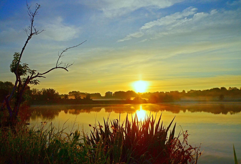 The sun at horizon, reflected in a pond. Wikimedia Commons.
