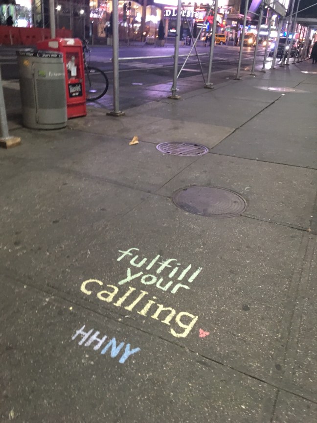 Photo Credit: Carson Smith. Hans Honschar is an artist who leaves encouraging chalk messages for people to discover throughout the neighborhoods of New York City. This says, “fulfill your calling, HHNY.”