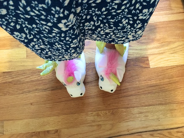 Right then, in a moment of great professionalism, I stood up and said, “I’m wearing unicorn slippers!” and showed them off to everyone. I was dressed up for the meeting, except for my mythical footwear, purposefully out of view on Zoom (because, of course). Then suddenly, every single person spontaneously retrieved a stuffed animal nearby them in their respective houses, and we showed them all off.