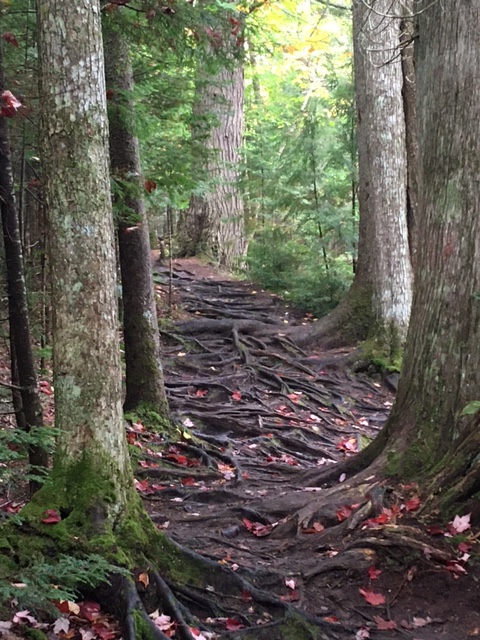 Image Description: Trees in a forrest with shared roots visible on the surface of the ground. Red, fallen leaves from autumn are interspersed among the roots. Photo, Renee Roederer.