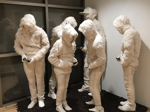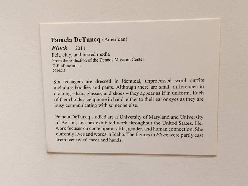 This piece of art really grabbed me. It’s called Flock by Pamela DeTuncq. The description says, “Six teenagers are dressed in identical wool, unprocessed outfits including hoodies and pants. Although there are small differences in clothing — hats, glasses, shoes — they appear as if in uniform. Each of them holds a cell phone in hand, either to their ears or eyes as they are busy communicating with someone else.”