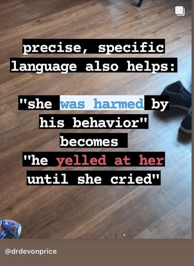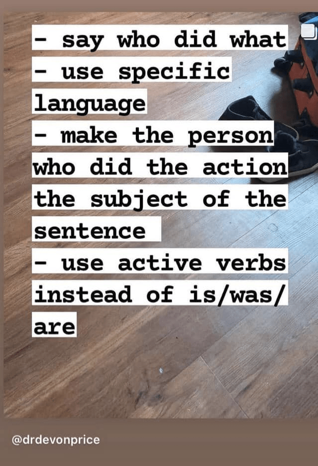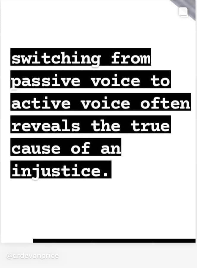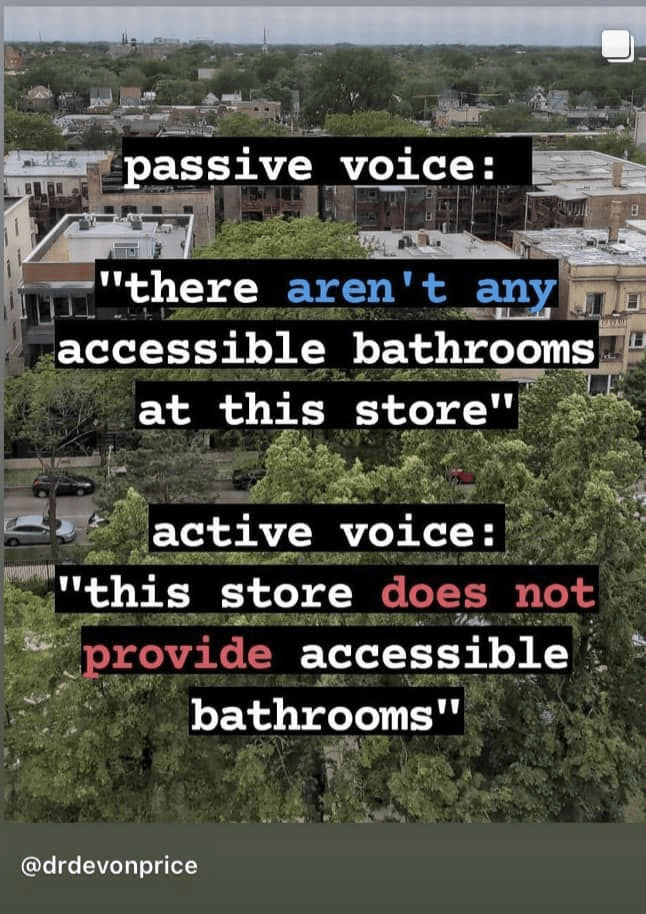 I’d love to share these images from Dr. Devon Price (@drdevonprice on Instagram). I am going to be checking myself when I use using passive language in these kinds of contexts. Text in comments.