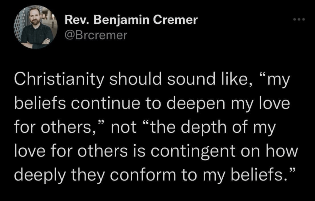 Yes Posted on August 9, 2022 by gracesmuggler A tweet from Rev. Benjamin Cremer (@Brcremer) reads, “Christianity should sound like, ‘my beliefs continue to deepen my love for others,’ not ‘the depth of my love for others is contingent on how deeply they conform to my beliefs.'” Share this: Share on X (Opens in new window) X Share on Facebook (Opens in new window) Facebook Like Loading... Related