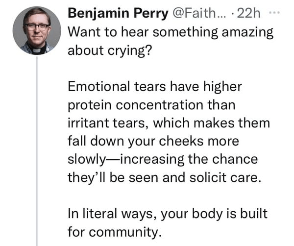 Tweet by Benjamin Perry reads, “What to hear something amazing about crying? Emotional tears have higher protein concentration that irritant tears, which makes them fall down your cheeks more slowly — increasing the chance that they’ll be seen and solicit care. In literal ways, your body is built for community.”