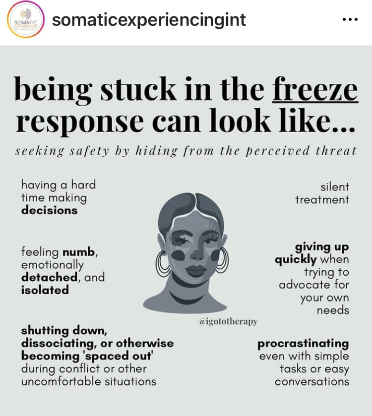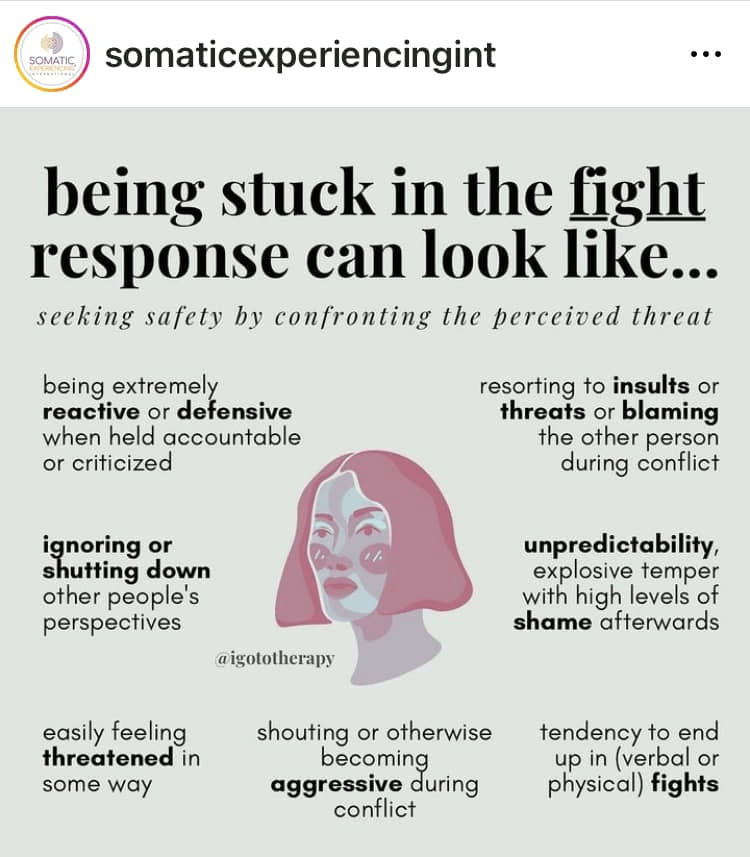 On Instagram, @Somaticexperiencingint and @igototherapy shared these images about fight, flight, freeze, and fawn reactions in relationships. We might see these emerge in friendships, romantic relationships, among family members, or within workplaces.