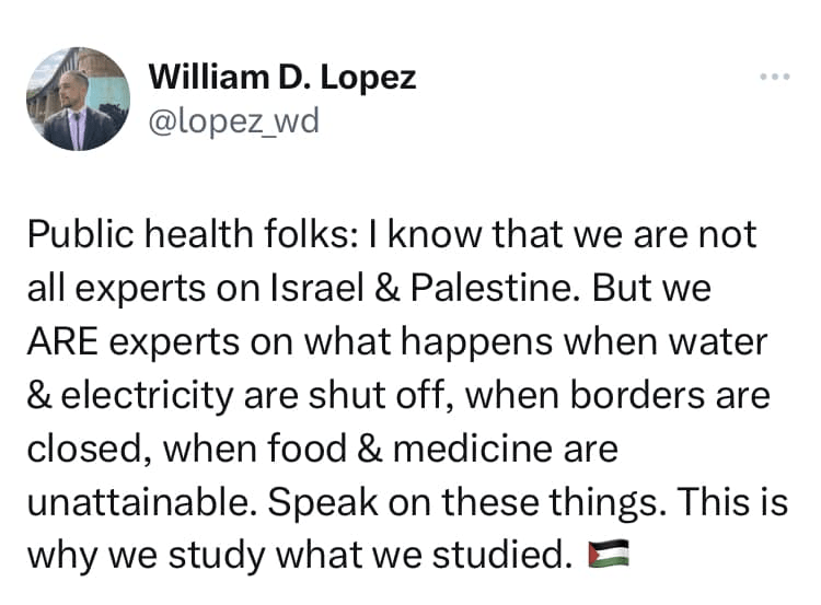 Public health folks: I know that we are not all experts on Israel & Palestine. But we ARE experts on what happens when water & electricity are shut off, when borders are closed, when food & medicine are unattainable. Speak on these things. This is why we study what we studied.