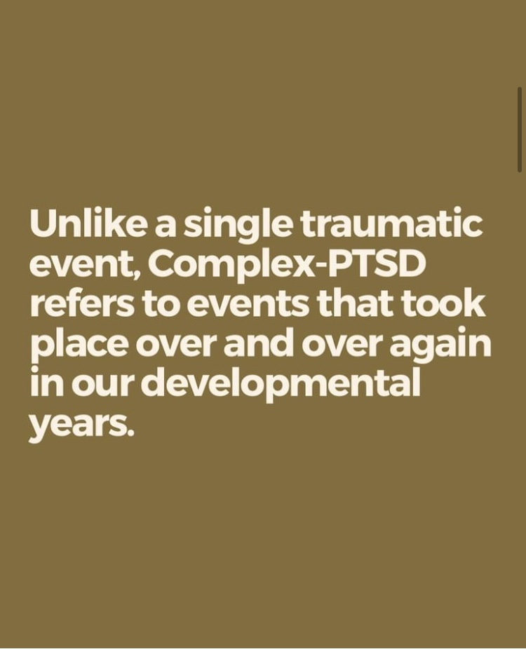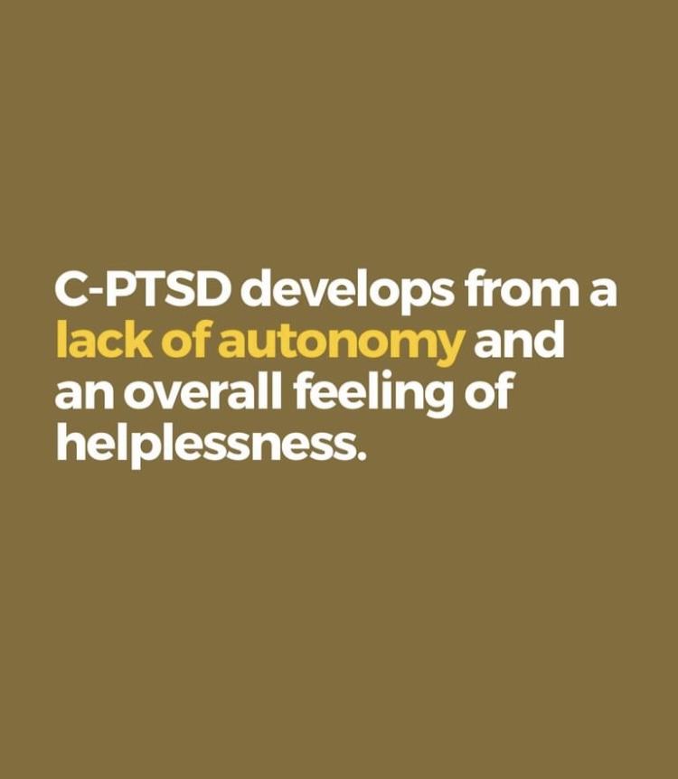 Text: C-PTSD develops from lack of autonomy and an overall feeling of helplessness.