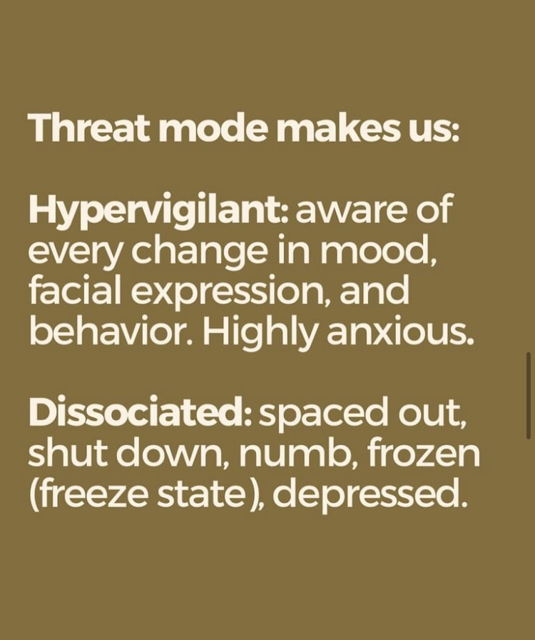 Text: Threat mode makes us: Hypervigilant: aware of every change in mood, facial expression, and behavior. Highly anxious. Dissociated: spaced out, shut down, numb, frozen (freeze state), depressed.