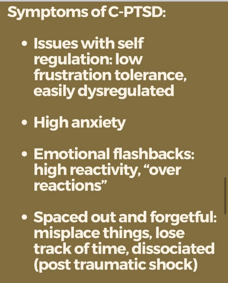 Text: Symptoms of C-PTSD: Issues with self regulation: low frustration tolerance, easily dysregulated, High anxiety, Emotional flashbacks: high reactivity, “over reactions,” Spaced out and forgetful: misplace things, lose track of time, dissociated (post traumatic shock)