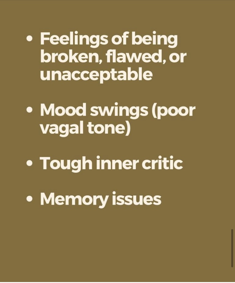 Text: Feelings of being broken, flawed, or unacceptable, Mood swings (poor vagal tone), Tough inner critic, Memory issues