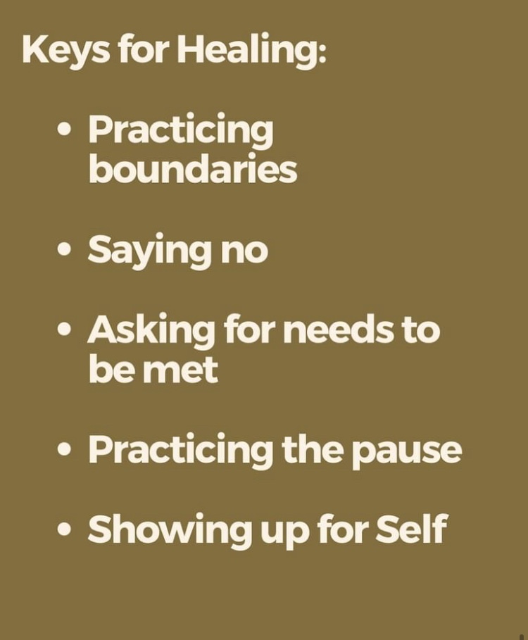 Text: Keys for Healing: Practicing boundaries, Saying no, Asking for needs to be met, Practicing the Pause, Showing up for Self
