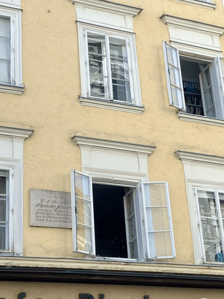 I spent a day in Salzburg (yes, the place where The Sound of Music was filmed) and it was gorgeous. Walking around on cobblestone, in the old part of the city, you can find the birth house of Wolfgang Amadeus Mozart where he lived until age 17 with the rest of his family. Then he moved to another location in the city. This birth house is 800 years old. Of course, there have been renovations over the centuries, but when he was born there in 1756, it was already more than 500 years old.