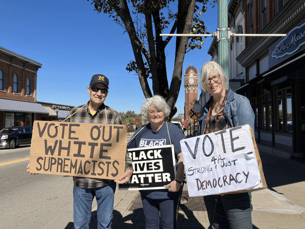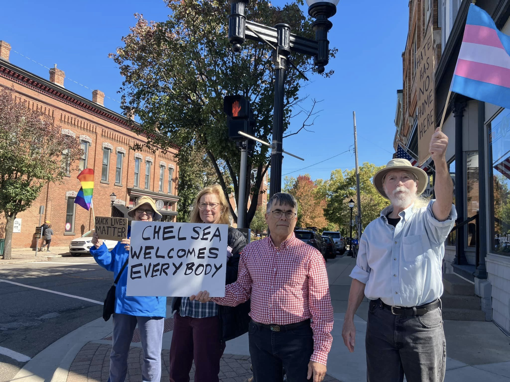 A friend and I were walking to lunch in Chelsea, Michigan when we saw people holding signs on all the street corners of the main intersection in town. “Chelsea Welcomes Everybody,” one sign read, as they also held anti-racist signs and LGBTQIA+ flags.
