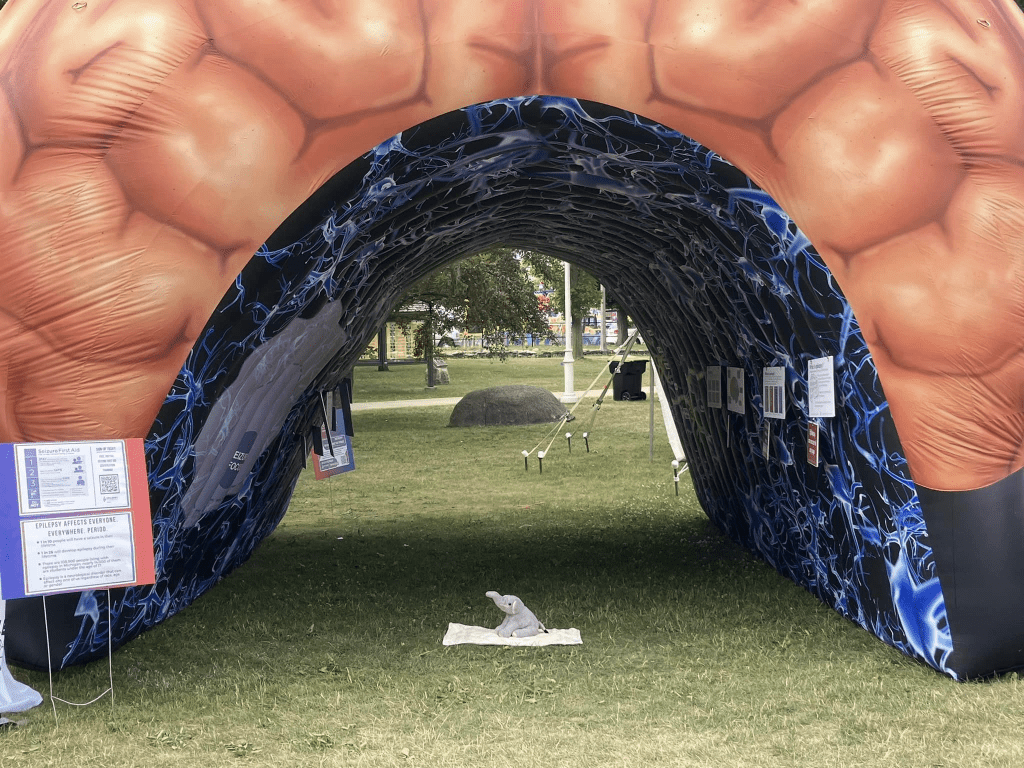 This is such a fun, educational tool, and we had our first full day yesterday. We invited people inside — though honestly, most people approached it themselves; it’s big and puffy! — and we had incredible conversations with the gathered community. We laughed. We affirmed the crafts that kids had assembled at a nearby booth (lots of kiddos were carrying wooden boats). We taught people about the brain, epilepsy, and seizures. We gave hugs. We cried with some people. And in ways that were most touching, we witnessed people discovering themselves represented: